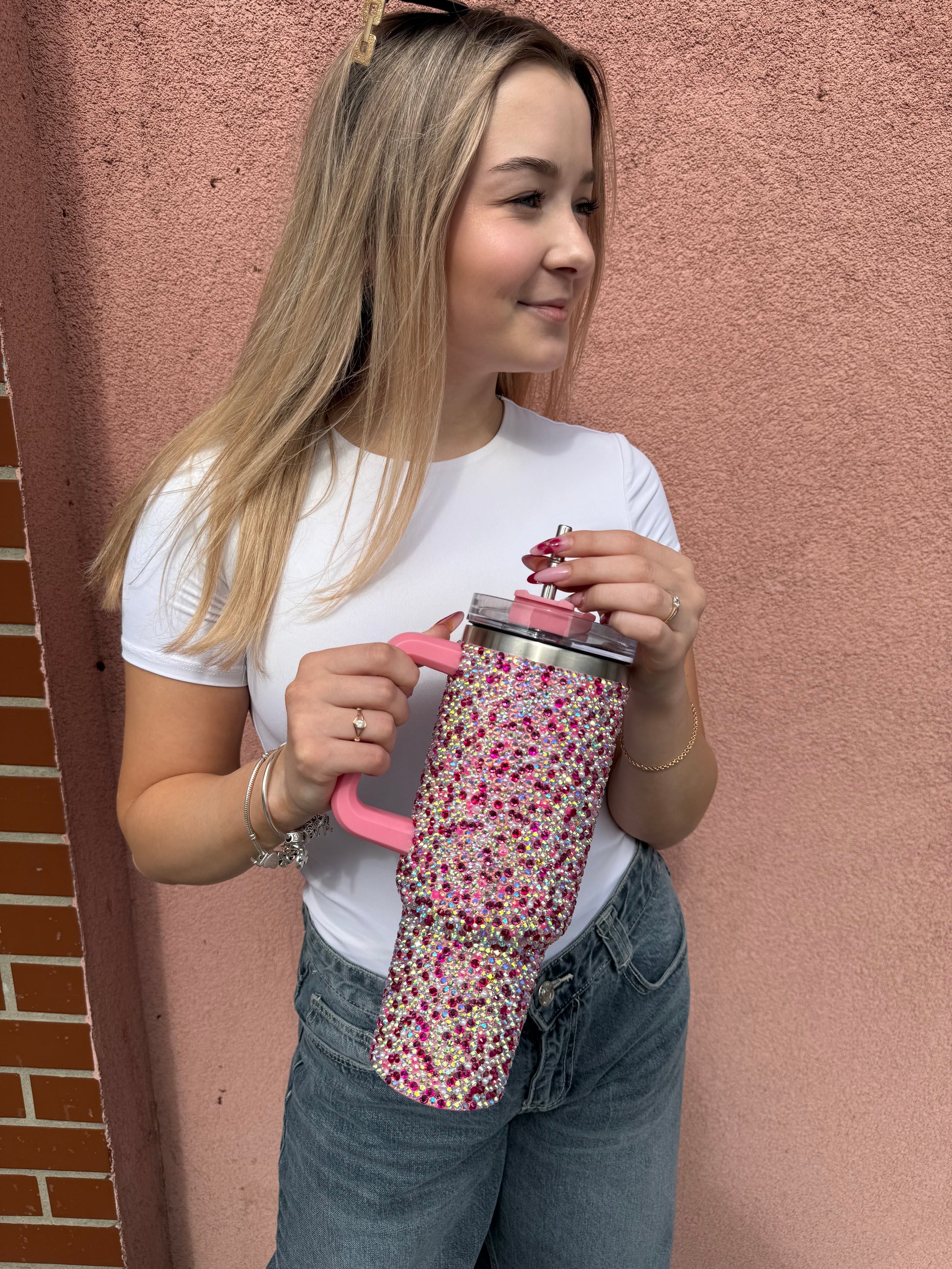 Kubek termiczny ze słomką w całości zdobiony najwyższej jakości kryształkami - szczelny!